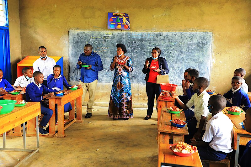 3. Urwunge rw’amashuri rwa Kinihira ruherereye mu murenge wa Kigeyo akagari ka Rukaragata aho Minisitiri n’abashyitsi bari kumwe bashishikarije abanyeshuri bose gufatira ifunguro ku ishuri kuko bituma ireme ry’uburezi ryiyongera umwana yiga nta nzara. Minisitiri yashimye ko iyi gahunda yubahirizwa kuri iki kigo asaba ko hakorwa ibishoboka byose ikitabirwa n’abanyeshuri 100%. Minisitiri yaboneyeho umwanya yifatanya n’abanyeshuri basangira ifunguro rya saa sita byutumye abanyeshuri bishimira gusangira n’umushyitsi mukuru.