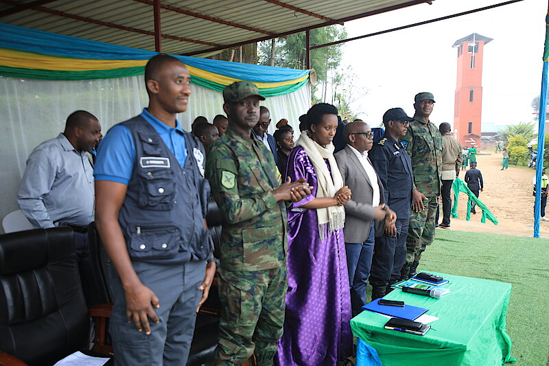 Guverineri yari kumwe n'abayobozi b'inzego z'umutekano mu ntara bakirwa n'Umuyobozi w'Akarere Madamu Kayitesi Dative ari kumwe n'abagize komite nyobozi y'Akarere ka Rutsiro.